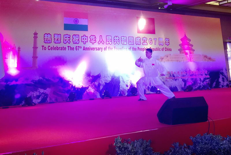 第二天,队伍乘坐大巴回到德里,参加驻印度使馆举办的国庆招待会。表演场地布置得张灯结彩、喜气洋洋。印度青年事务与体育部国务部长、印议会、外交部、商务部、文化人士、媒体人士、外国及国际组织驻印使节等550余人出席了招待会。表演团表演了7个节目,太极拳的行云流水、醉拳的潇洒幽默、长拳的舒展大方、咏春拳的刚柔并济、南拳的威猛迅疾,赢得了来宾阵阵掌声和喝彩。表演结束后,驻印度大使罗照辉和夫人、驻印度公使刘劲松和印度青体部部长与队伍合影留念。大使对运动员们夸赞说:"你们表演得很好啊!"  高德温学校表演前