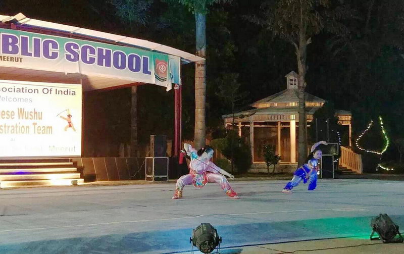 10月2日,队伍来到印度武协总部的所在地米拉特市。印度武协主席巴卓先生在高德温公立学校热情欢迎队伍一行。巴卓先生多年来不遗余力地在印度开展武术运动。他本人多次访问中国,热爱中国文化,热爱武术。在他的领导下,现印度各省均有武术协会,定期开展各类武术比赛和活动,武术运动如火如荼。他成立的高德温公立学校设有武术课程,吸引了很多学生参加。演出前,学校举行了简短而隆重的欢迎仪式。当地的议长和社会名流均到场观看演出。表演赢得了师生们热烈的掌声和喝彩。  表演结束后合影