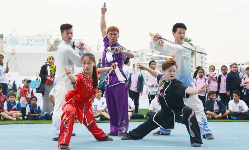 2017年2月15日至19日,中国武术代表团一行六人(郑楠、颜志威、李宝佳、蒋誉华、崔广霞、黄蓉)赴阿联酋参加了全民健身日武术表演与教学活动。所到之处,受到了当地人民和华人华侨的热烈欢迎,表演与教学取得圆满成功,引起了轰动效应。 表演震撼全场 2017年2月16日,阿联酋全民健身日活动在迪拜警官俱乐部体育场隆重举行。中国武术协会从武汉体院抽调了5名优秀运动员组成武术代表团,与迪拜精武会的教练员一道参加了此次活动,并在最后一个压轴出场。代表团展示了集体拳、集体剑、太极拳、刀术、棍术、枪术、南拳、南刀、披挂拳、朴刀、单鞭、双钩等武术项目,为阿联酋人民献上了一场精彩绝伦的武术视觉盛宴。现场观众看得目不转睛、如痴如醉,随后爆发出热烈的掌声,表演收到了轰动效果。同时,经过迪拜精武会培训的300名阿联酋小学生展示了他们所学的中国武术,得到了各方的一致好评和高度认可。 中国驻迪拜总领馆总领事李凌冰女士、副总领事王振山先生,办公室主任徐海风先生、秘书丁梦颖女士、巴林孔子学院院长吴雪颖女士、教员黄鑫女士、迪拜警察官员等嘉宾出席了本次活动,阿联酋川渝商会同乡会、阿联酋华侨华人妇女联合会的代表们也来到现场,为中国武术代表团和小朋友们加油助威,共享来自祖国的武术嘉年华。 互动广受欢迎 除阿联酋全民健身日活动的现场表演外,中国武术代表团还深入到内政部直属的公立阿联酋国家学校(Emirates national school)和沙迦美国国际学校(Sharjah American international school),与广大师生进行了武术互动和表演。表演震撼了在场的观众,孩子们叫好不断,纷纷模仿教练员的动作。随后,代表团成员和迪拜精武会的教练员一起辅导孩子们学习武术动作,现场氛围热烈,最终大家共同合影留念。精彩的表演和互动也打动了校方管理层,为下一步武术在阿联酋校园的全面铺开奠定了坚实的基础。 推广效果斐然 2014年,由许峰先生和丛小玲教授创立的迪拜精武会走进阿联酋,开始在这里推广武术。他们以中国穆斯林武术为切入点,求同存异,立即得到了阿联酋人民的认可和喜爱。在经费短缺的情况下,在热心华商的大力支持下,经过两年多的免费教学和艰苦努力,逐步将中国武术推广进入阿联酋的中小学,使武术成为促进阿联酋学生身心健康、锻炼意志品质的有效手段。自创立至今已累计培训学员逾万多人。在今后的日子里,精武会将积极促成阿联酋武术协会的成立,并希望通过武术来传递健康、和谐的生活方式,将武术文化传播到阿联酋的每一个角落,并在不久的将来,培养出阿联酋的第一个武术世界冠军。(文/郑楠 图/何广伟、郑楠)  代表团、精武会与总领馆李凌冰总领事、王振山副总领事合影